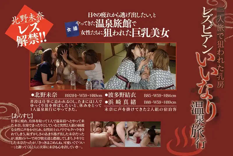 [Kitano Mina’s lesbian debut!] Tired from her daily work, Mina takes a day off and goes on a solo trip to a hot spring. While relaxing in the women’s bath, she is suddenly approached by a pair of beautiful women… Mina is spotted by a lesbian couple looking for “tonight’s fun” on their trip, and she can’t refuse, being made to orgasm all night long by their melting lesbian torture…! Kitano Mina reaches the height of happiness with her first lesbian experience! The bonus footage also includes a “wake-up prank” off-camera threesome the morning after filming.